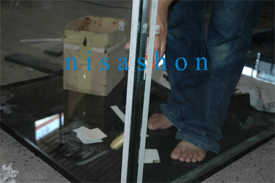 เอากระจกกั้นหน้ากรองมาติดตั้งเข้า กระจกแผ่นนี้รับน้ำหนักมากต้องเป็นกระจกที่มีความหนาเท่ากับตู้ใหญ่ครับ