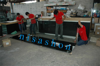 ในที่นี้จะทำการประกอบตู้ปลาขนาด 144 x 40 x 40 นิ้ว ตู้ใบนี้เป็นของคุณอนุชิต อยู่ที่จังหวัดกาฬสินธุ์ โดยใช้กระจกเทมเปอร์ขนาดความหนา 15 มม. ระบบกรองใต้ตู้
