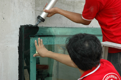 ทางร้านนิศาชล ได้รับโอกาสจากคุณทัศนัย ให้ทำการ ติดตั้งกระจกช่องหน้าต่างบ่อปลาขนาดประมาณ 60 ตัน ที่ อำเภอพิมาย จังหวัดนครราชสีมา โดยช่องหน้าต่าง มีความกว้าง 1 x 3.30 เมตร ทางร้านได้เลือกใช้กระจกเทมเปอร์ ลามีเนต ขนาด 19+19 มม. ได้ทำการติดตั้งกระจกติดกับขอบสแตนเลส มีความกว้าง 3 นิ้วและทำการเชื่อมยึดติดกับโครงสร้างของบ่อปลา